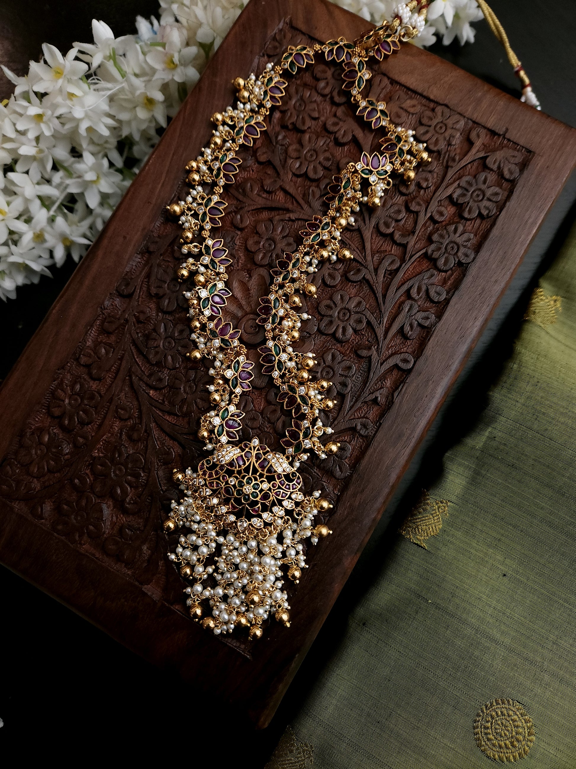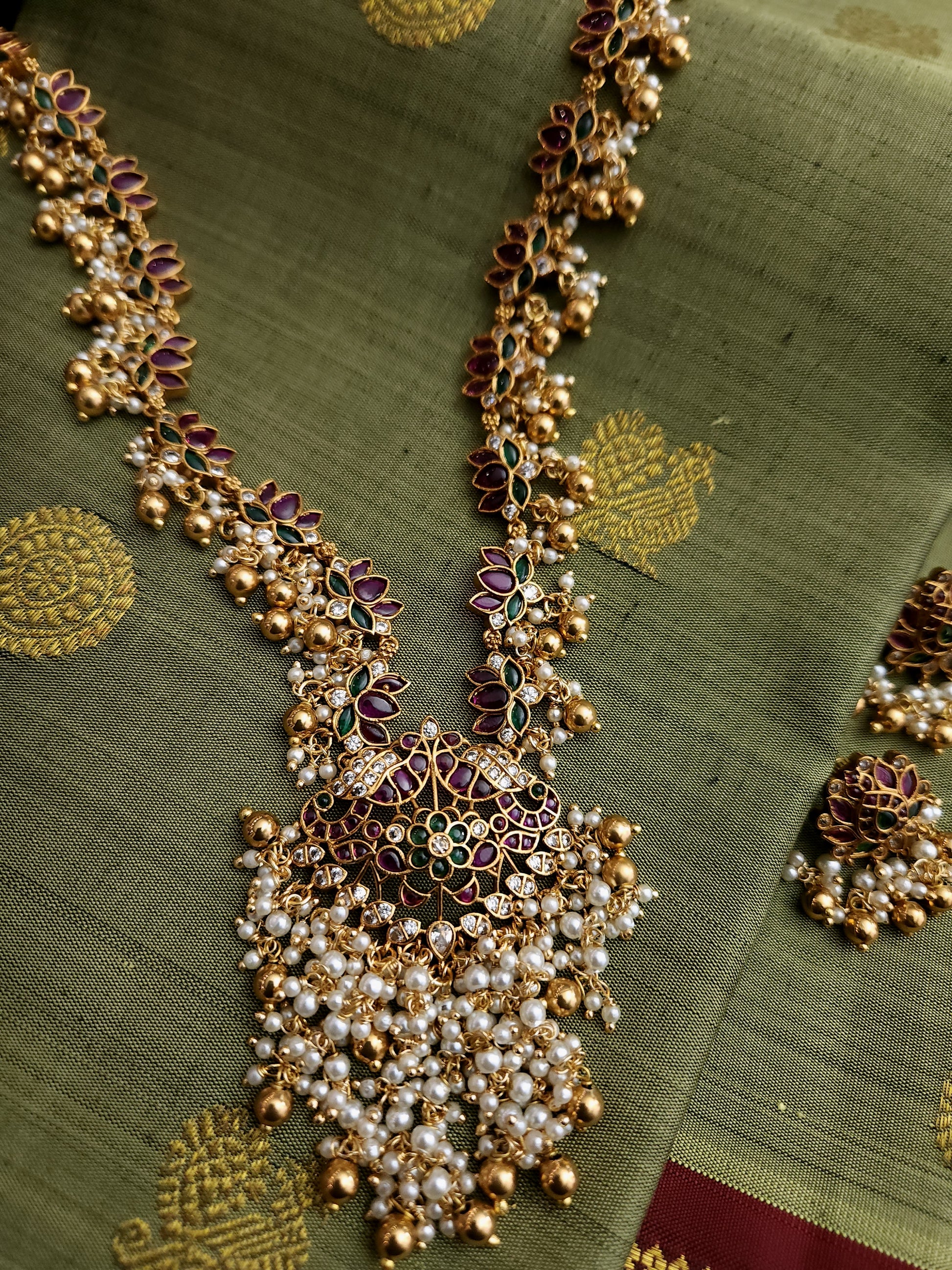 Long kemp haaram loaded with pearls , paired with stunning earrings. This intricate and elegant set includes a stunning haaram adorned with pearls, along with perfectly paired earrings that will elevate any outfit. Made with high-quality materials, it's a sophisticated and timeless accessory that is perfect for formal occasions or everyday wear.