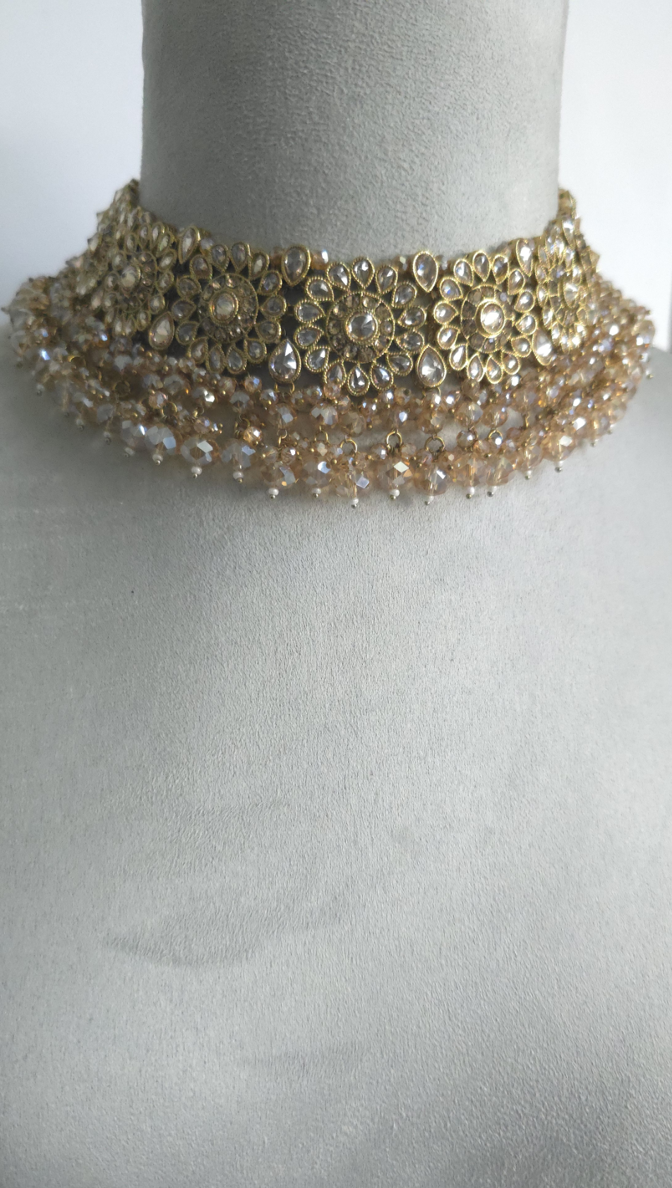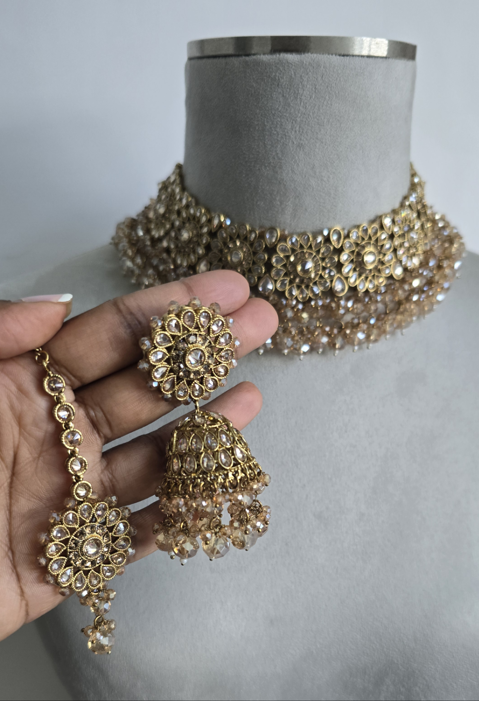 Flexible Choker set with matching earrings and tikka. Made on antique gold base with clear crystals